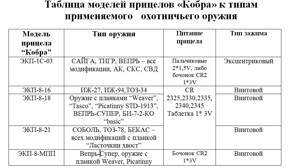 Комментарий к файлу: Таблица моделей прицелов КОБРА к типам применяемого охотничьего оружия