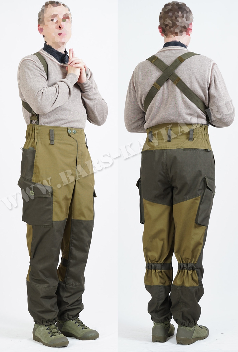 Брюки имеют 8 карманов: 2-а задних прорезных с клапаном на потайных пуговицах, 2-а в боковых швах с дуговыми входами, 2-а боковых накладных кармана, 2-а нижних специальных под ИПП (на уровне голени). Набедренный боковой накладной карман с клапаном, чуть смещен вперед и застегивается на широкие 4-х сантиметровые липучки, имеет большой объем, который достигается за счет 3-х фронтальных и одной задней боковой складки. Верх кармана имеет утяжку резиновым шнуром с фиксатором, конец шнура оформлен пластиковым наконечником и выведен внутрь кармана. Особенностью кармана является его скошенный передний край, данное решение обеспечивает удобство пользования карманом в положении сидя и плюс карман удобнее при ношении тактических набедренных кабур и подсумков. Нижние (на голени) накладные карманы «портфельчиком» исполнены под размеры российского «Пакета Перевязочного Индивидуального ППИ АВ-3». Внизу бокового набедренного кармана и кармана под ИПП имеются дренажные отверстие для вентиляции и слива воды из кармана. На брюки двойной строчкой настрочены усилительные накладки: овальные в области ягодиц и прямоугольные на коленях. Наколенные усилительные накладки выполнены в виде накладного кармана с отверстием, застегивающимся на липучку, для размещения демпферных наколенников. Низ брюк может стягиваться подрезиненым шнуром, для фиксации концов которого (чтобы не торчали) в подгибку низа с внутренней стороны вшита петелька. По требованию заказчика по низу брюк могут быть пришиты штрипки из перфорированной резинки.