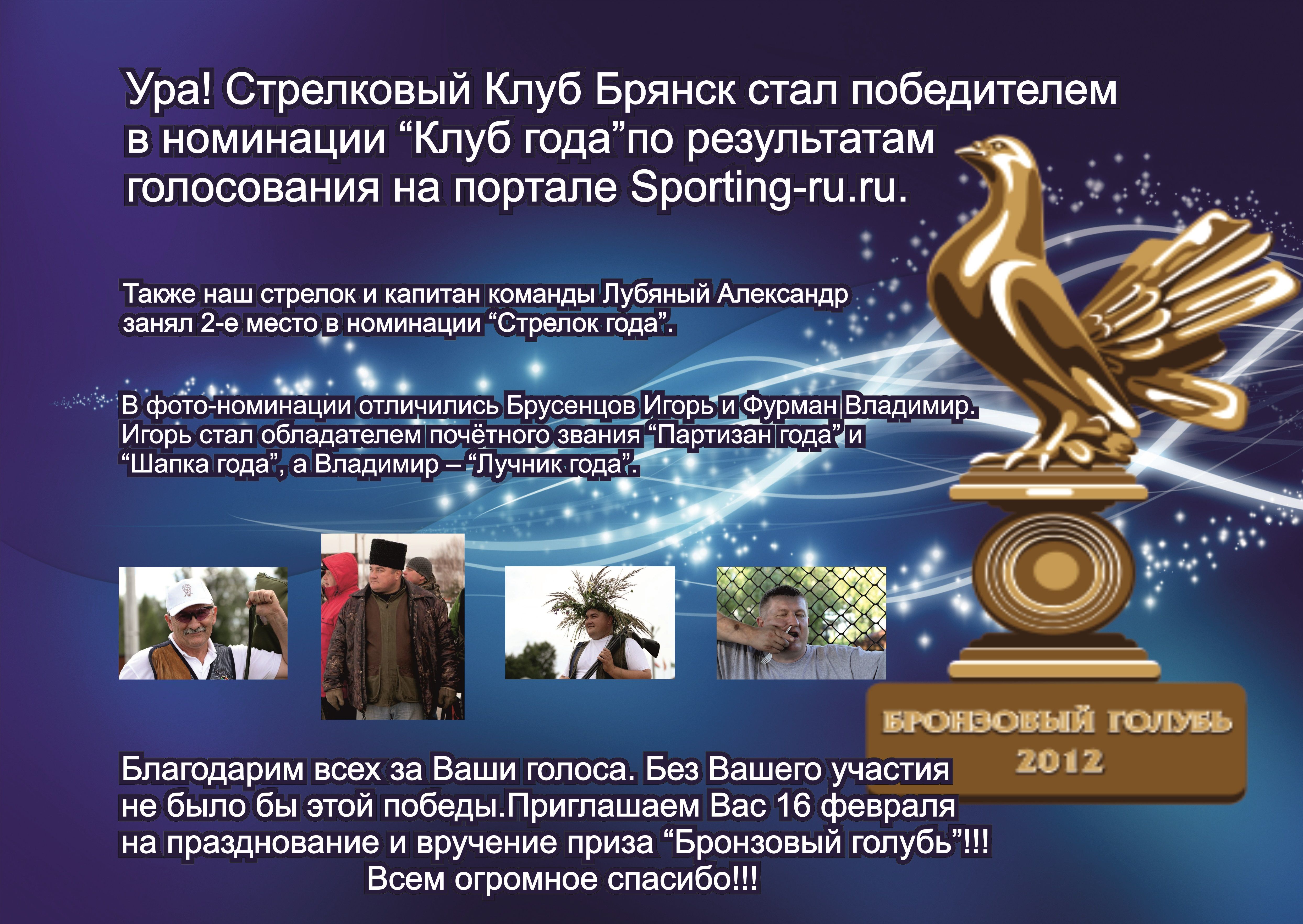 На сайте http://www.sporting-ru.ru/ проводится голосование на звание лучшего стрелкового клуба года БРОНЗОВЫЙ ГОЛУБЬ - 2012