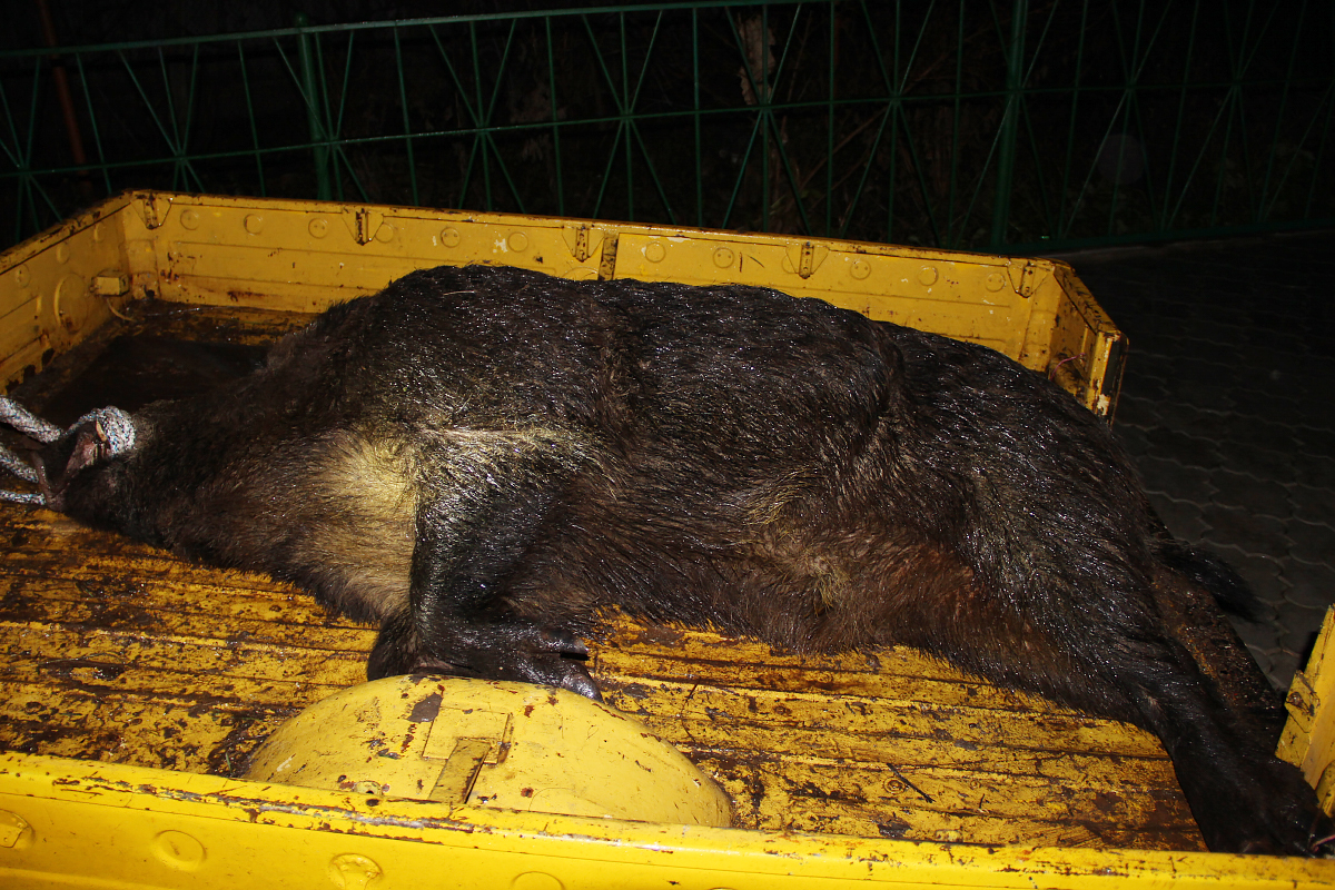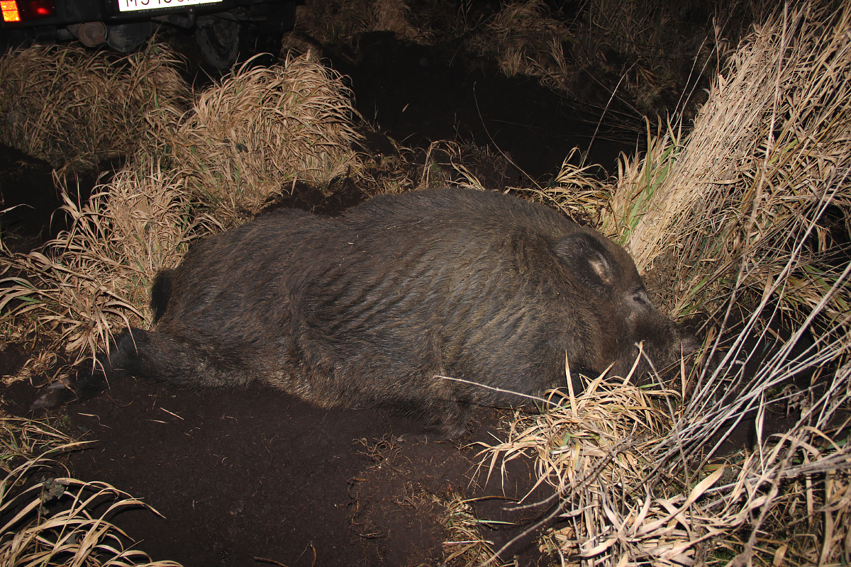 А это ещё один отчёт об удачной, но очень долгой охоте. «ПРОФЕССОР» Первый раз я познакомился с этим одинцом-вепрем в конце августа 2013 года, когда выходил манить лося на Ваб. В первое с ним знакомство - я слышал, как одинец пожирал только упавшие жёлуди под дубом, а я стоял и слушал, не имея возможности увидеть его, так как нас разделяла длинная полоса высокого череда и густого кустарника, а он был так близко от меня, меньше 50 метров. Но, если перефразировать поговорку- то получится « слышит ухо - да зуб не ймёт». У меня не было тогда возможности бесшумно выйти на позицию, чтобы не быть обнаруженным и добыть этого кабана. Дальше пошла полоса охот, когда я видел результаты жировки этого вепря, но как я ни старался, но добыть его никак не мог. Причём старался ни я один, а ещё три моих знакомых охотника. Причём все с прицелами ночного виденья, а это тебе ни хухры-мухры. А один из них меня учил в период моей охотничьей юности ночным премудростям добычи кабана, т.е. охота на этого вепря велась серьёзная. Но этот кабан просто играл с нами охотниками дерзко, нагло и частенько непредсказуемо. Плюс этот вепрь-одинец был чертовски везучий. Причём ему везло просто фатально. И как-то собравшись вместе, и обсуждая тактику поведения этого одинца, кто-то сказал, что это ни кабан, а «профессор» какой-то. Так и прилипла к этому одинцу прозвище - «Профессор». Скажу что из себя представляет местность, где проходили эти охоты. Это участок поля, на котором выкосили траву в длину около 1500 метров и шириною около 500 метров (проверено Гуглом), окружённый лесом. Но трудность заключалась в том, что эту местность с юго-востока на северо-запад разделяла речка-ручей, заросшая по берегам камышом, чередом, высокой осокой и травами, местами густым кустарником. В которой, осуществлял свои скрытые перемещения, куда ему надо «Профессор». Но плюсом было то, что с северо-востока на юго-запад его разделяла асфальтированная дорога местного значения. Таким образом, эта местность речкой и дорогой практически под прямыми углами разделяется на как бы четыре поля, а в центре мост. Вот на этих четырёх полях мы этого «Профессора» и пильновали. И так коротко расскажу о череде моих неудачных охот и череде везений нашего «Профессора». Вторая серия- это серия засидок. Сделал засидку, а точнее целых четыре, насыпал кукурузы и стал по-возможности выезжать на эти засидки. К этим засидкам приходил не только наш «Профессор», но и выходили стада свиней, но стада приходят и уходят, а «Профессор» живёт и никуда не уходит. Вёл «Профессор» как говориться оседлый образ жизни. Надо сказать, что на этом участке было три одинца. Одного я взял ранее (Отчёт об открытии сезона 2013 года), а вот два осталось. «Профессор» был по следу крупнее другого одинца, смелее, так как появлялся в ту же ночь после дневной загонной охоты, тогда как другой одинец мог появиться лишь спустя двое-трое суток, или вовсе на неделю, другую исчезнуть с данных полей. Эту информацию я получал методом периодического наблюдения за покопами земли оставленными кабанами после ночных жировок на скошенных этих 4-х лугах, по размерам и количеству следов, площадей поднятой земли. Так как луга выходили «бороздить» не только эти одиночки, но и стада свиней. В один вечер мой товарищ насчитал на одном из 4-х скошенных лугов тридцать взрослых особей, но когда увиде