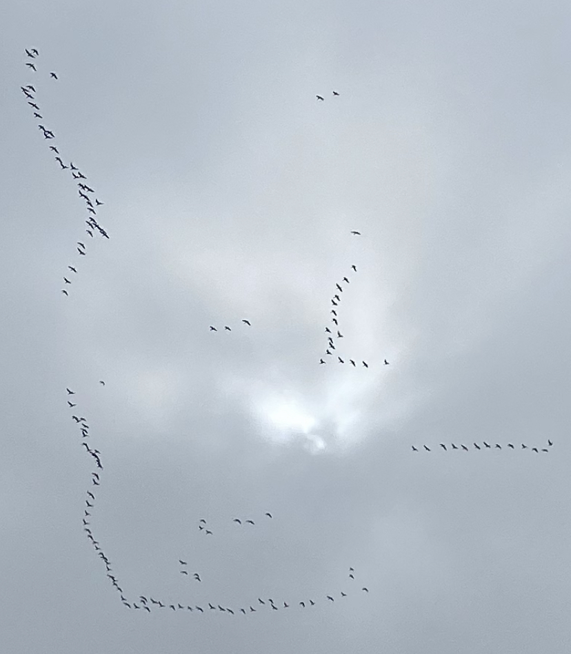 Ближе к 11 часам началось перемещение птицы на поля, удивила тактика гусей, низко летят, дистанция перелета небольшая и без облета ныряют на поле.