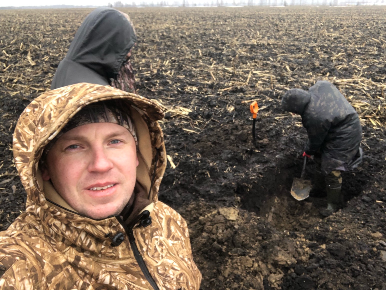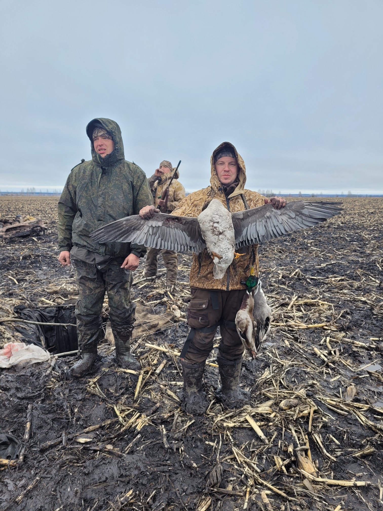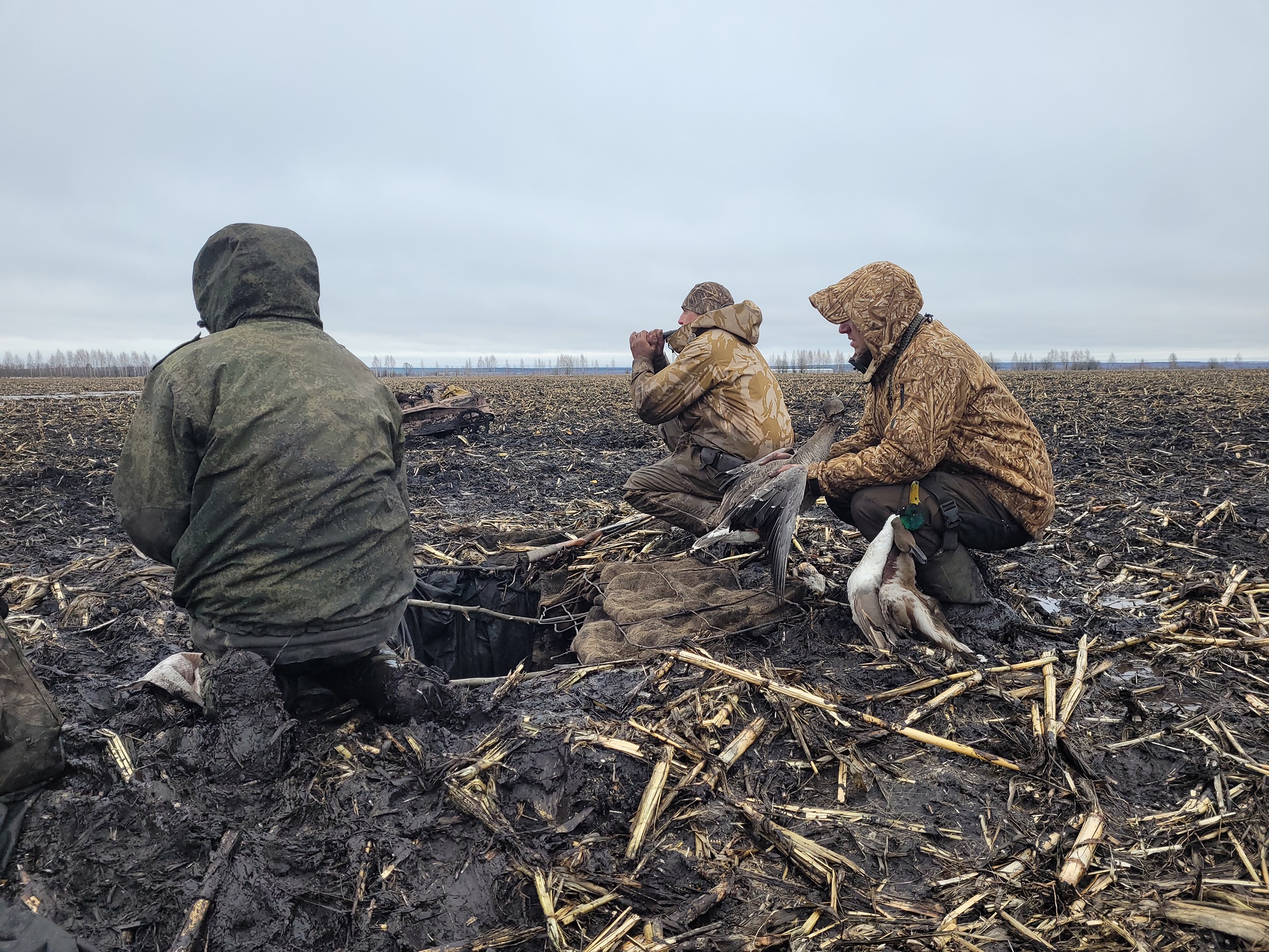 Когда готовили скрадки, гуси налетали постоянно, что сильно воодушевляло. Утро встретило нас приличным дождиком с хорошими налета когда он прекращался.