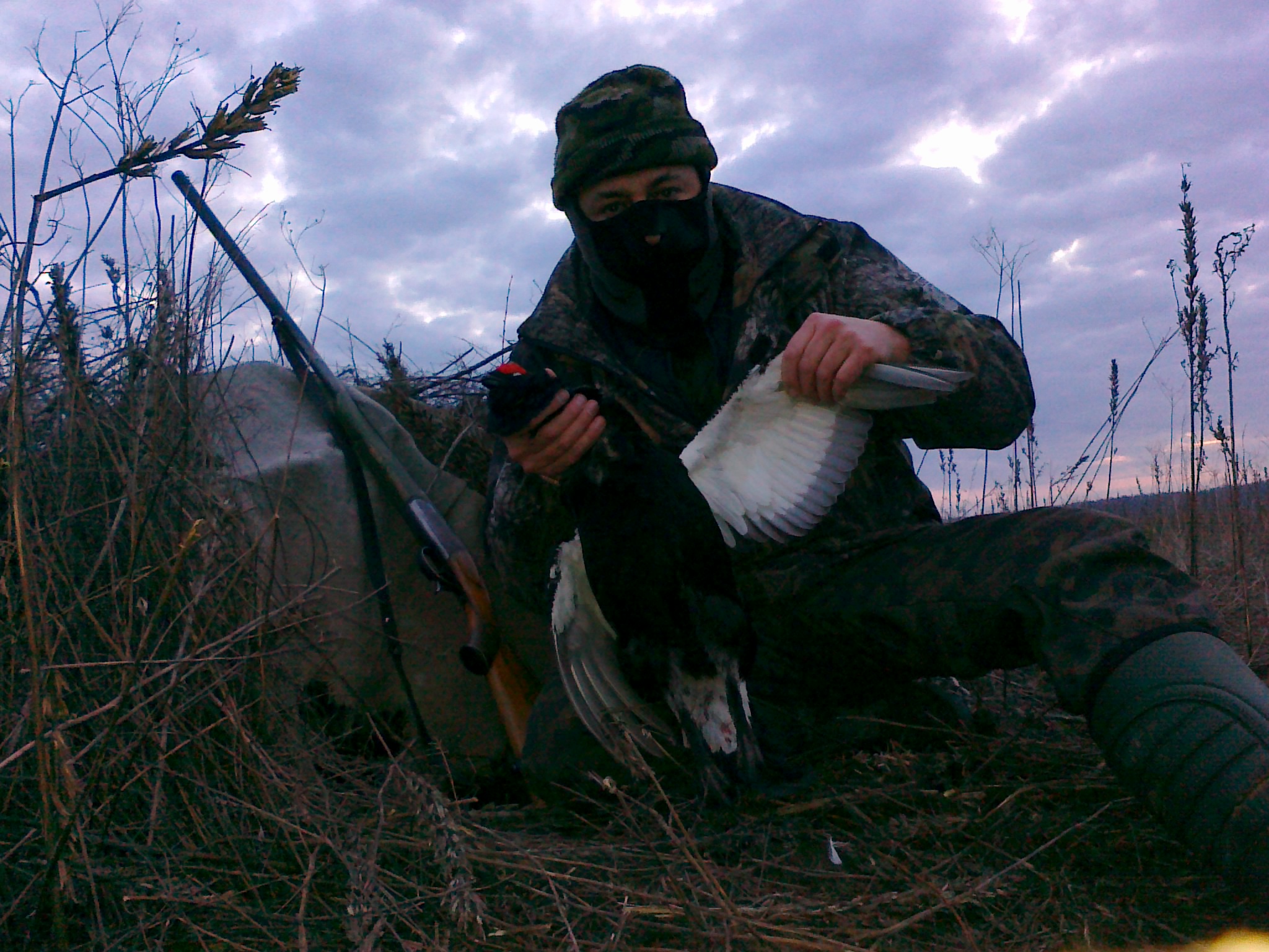 Вчера сбили меня поехать поохотится на поля, мол утки море гусь налетает вообщем пернатое эльдорадо, я значит повёлся. Погодка была изумительная приеехал: Воды куда подсадную посадить мало, при учёте что гектара на 4 было 10 охотников, (я в бинокль насчитал) все лужи сконцентрированы в одном месте так что не разгуляешся. Ладно разошлись выбрали места выкопали ямки как смогли замоскировались стали ждать. Гусь на самом деле летал толпами так много я не видел давно но (в чём лмшний раз убедился) в охоте на гуся мелочей не бывает из за плохой маскировки на выстрел не налетал хотя другие горе охотники долбили по чём свет стоит. По утке, утка есть но в основном как я понял пролётная и тоже идёт на кислороде но когда стемнеет идёт низко но не видно где селезень поэтому стрелять мог раз 15 но не стал а просто слушал свист крыльев. ВЫВОД: Утки реально много, да и гуся не мало но больше не поеду к таким охотам надо готовится основательно, лучше по старинке на разлив. Хотя для любителей пострелять в ночи по всём подряд эта охота в полне подойдёт.
