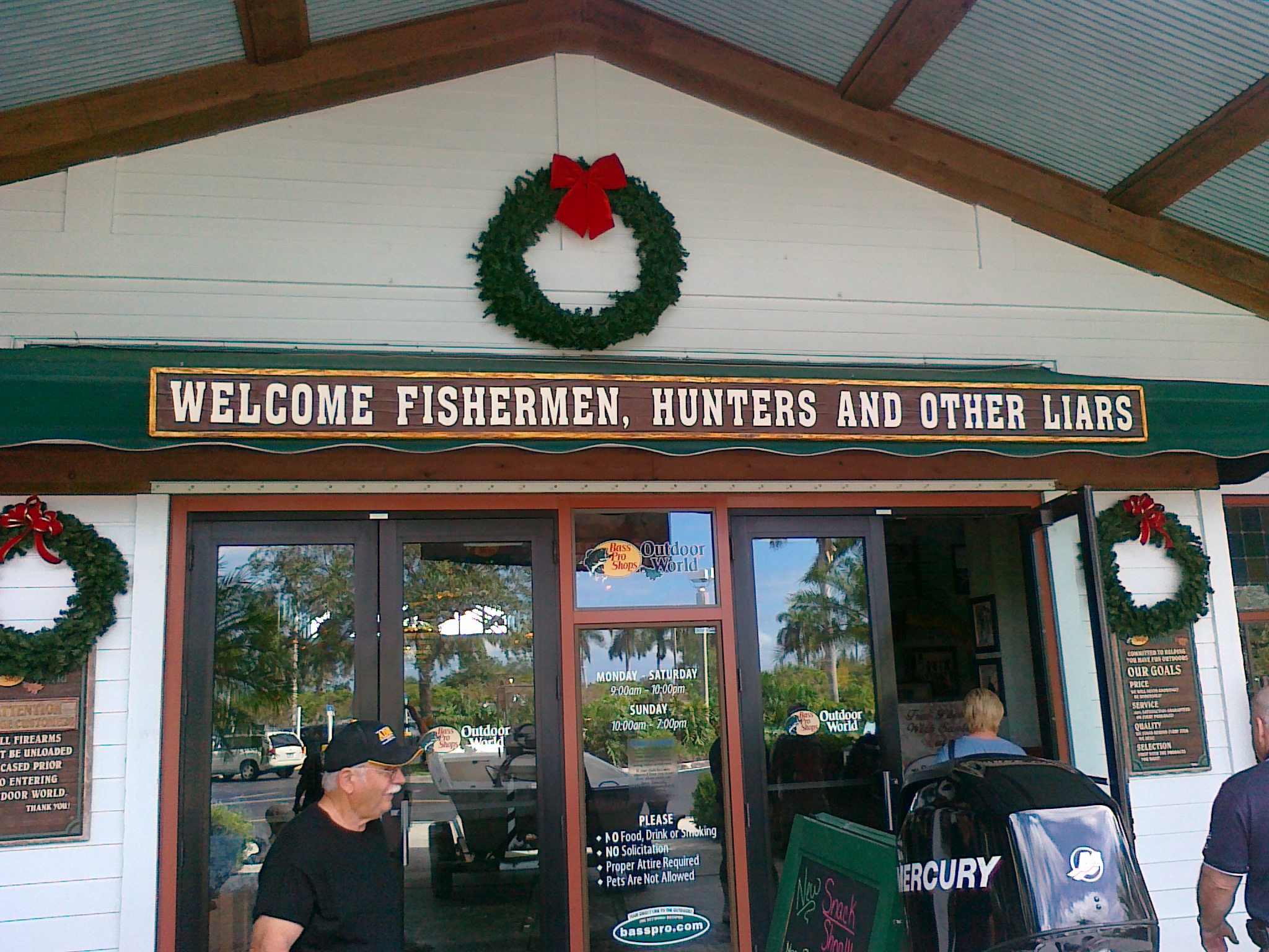 Надпись на входе переводится кажется так: "Добро пожаловать рыбаки, охотники и другие лгуны".