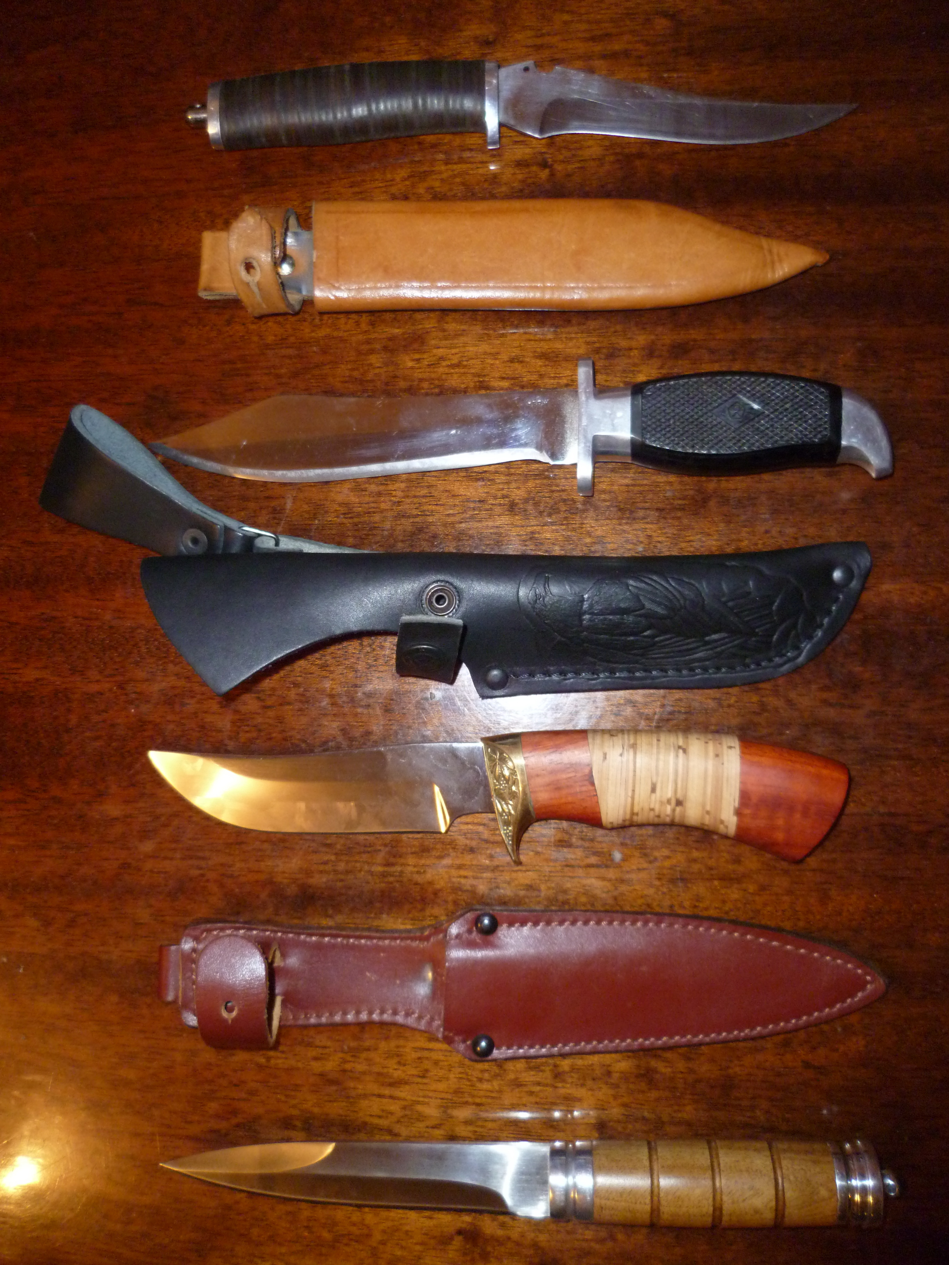 Вот небольшой наборчик и моих кинжальчиков! Володь, на вскидку, что из этого шерпотрепа более или менее толковое! Скажу лишь, что совдеповский кинжальчик со мной лет 15 уже, везде его таскаю, правда РК у него до боли сомнительная, но заточку держит прекрасно!