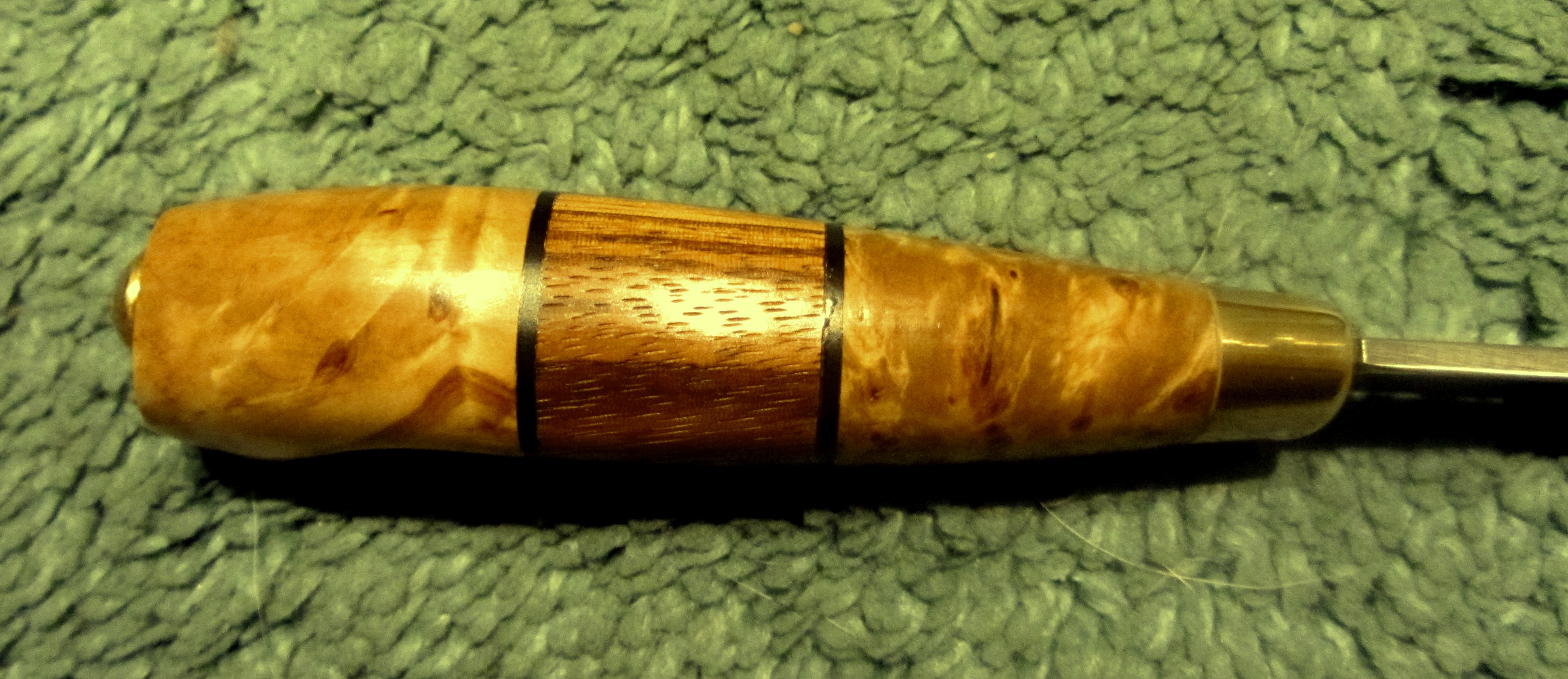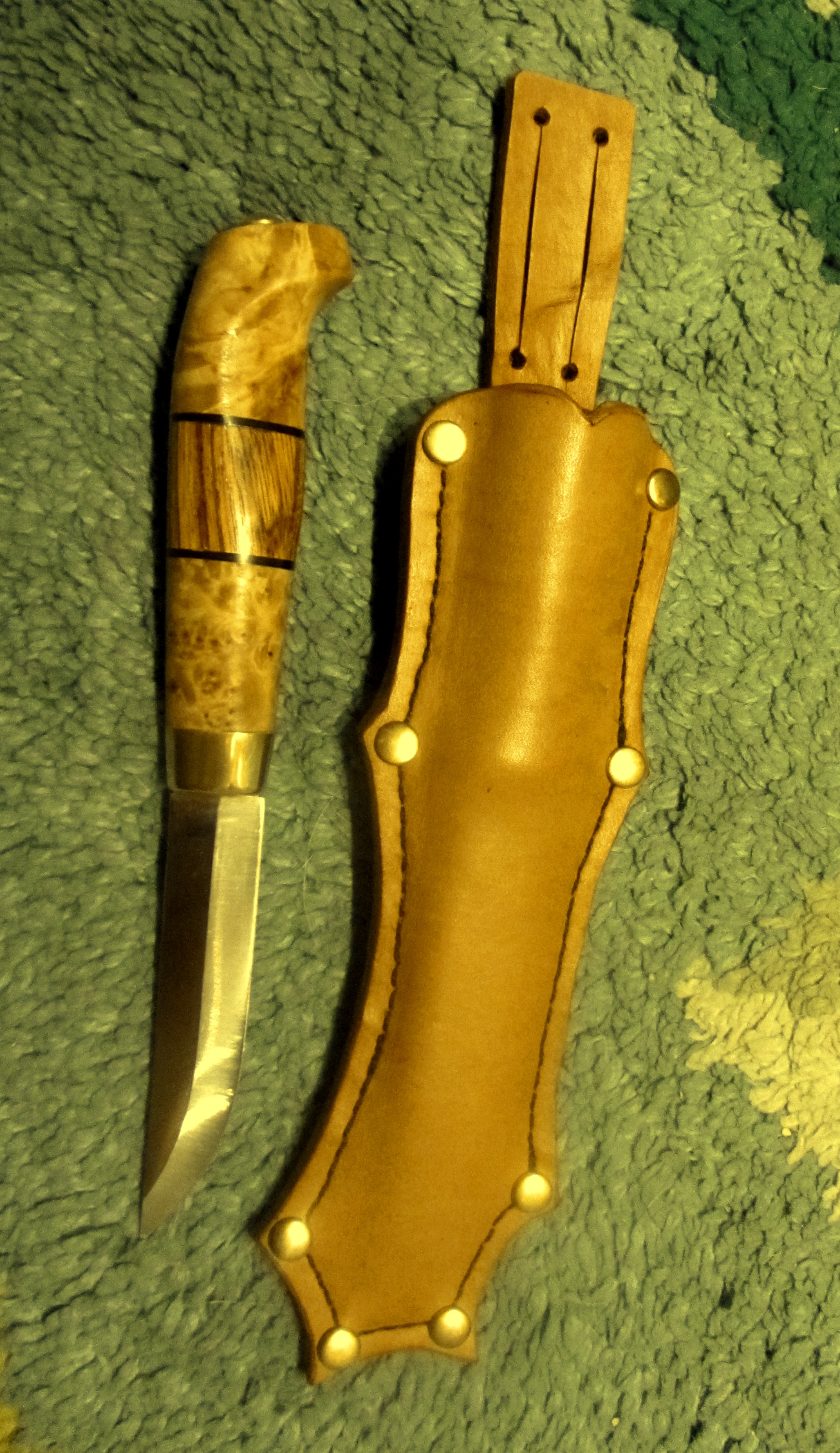Рукоять: оковка латунь, кап берёзы, фибра, зебрано, сувель берёзы. Монтаж сквозной, в расклёп+эпоксилин. Пропитка тикойлом, карнаубский воск.