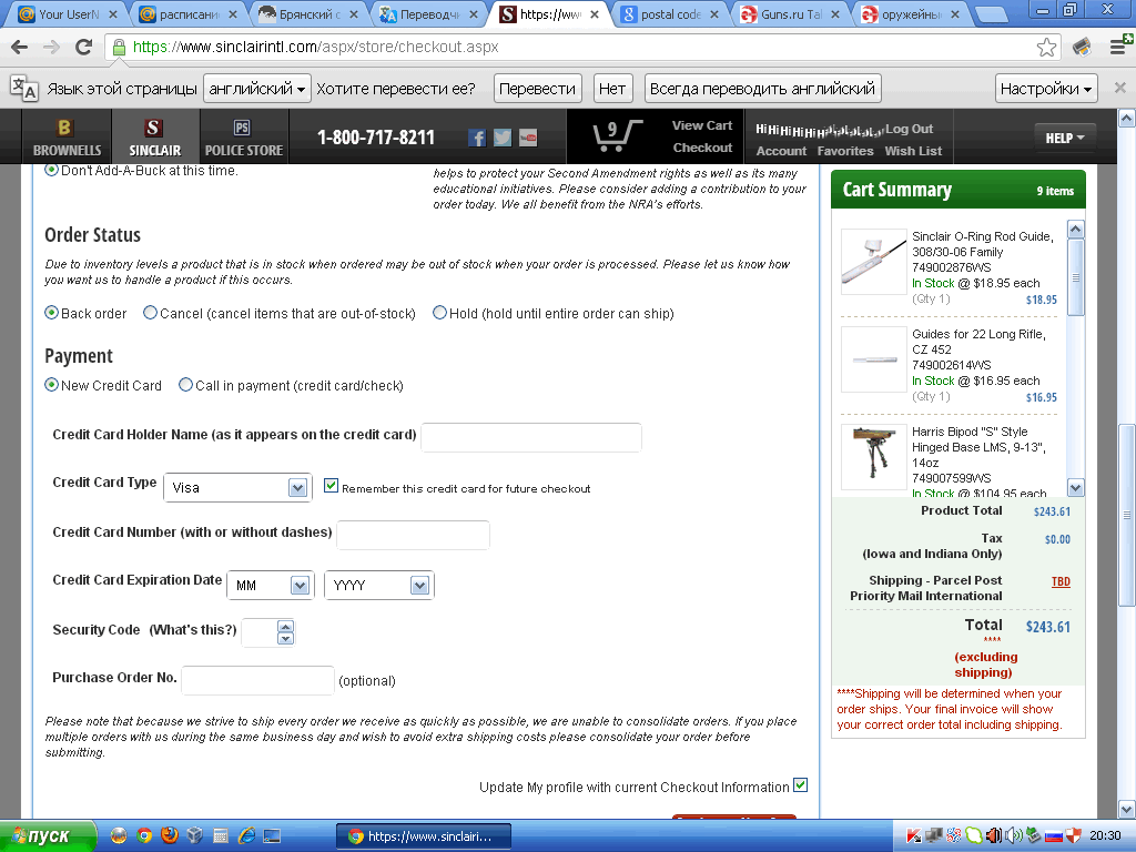 Набрал на sinclairintl.com товара, а когда указываю данные банковской карты пишет такую хрень: