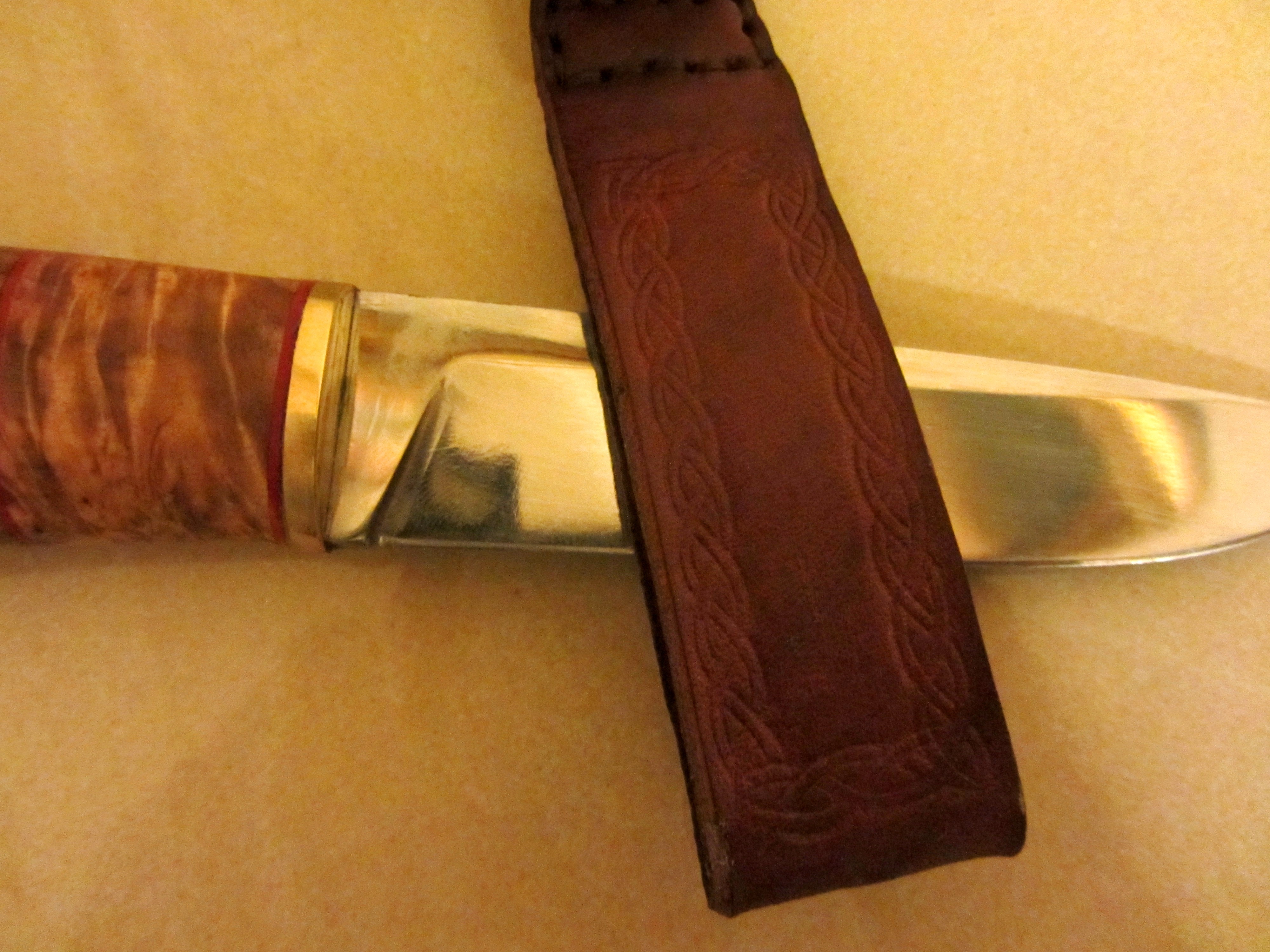 Закончил новую вещь. Поэксперементировал с ножнами. Попытался сделать комплект в скандинавском стиле, хотя клинок не скандинав. Короче получился такой вот "Микс".