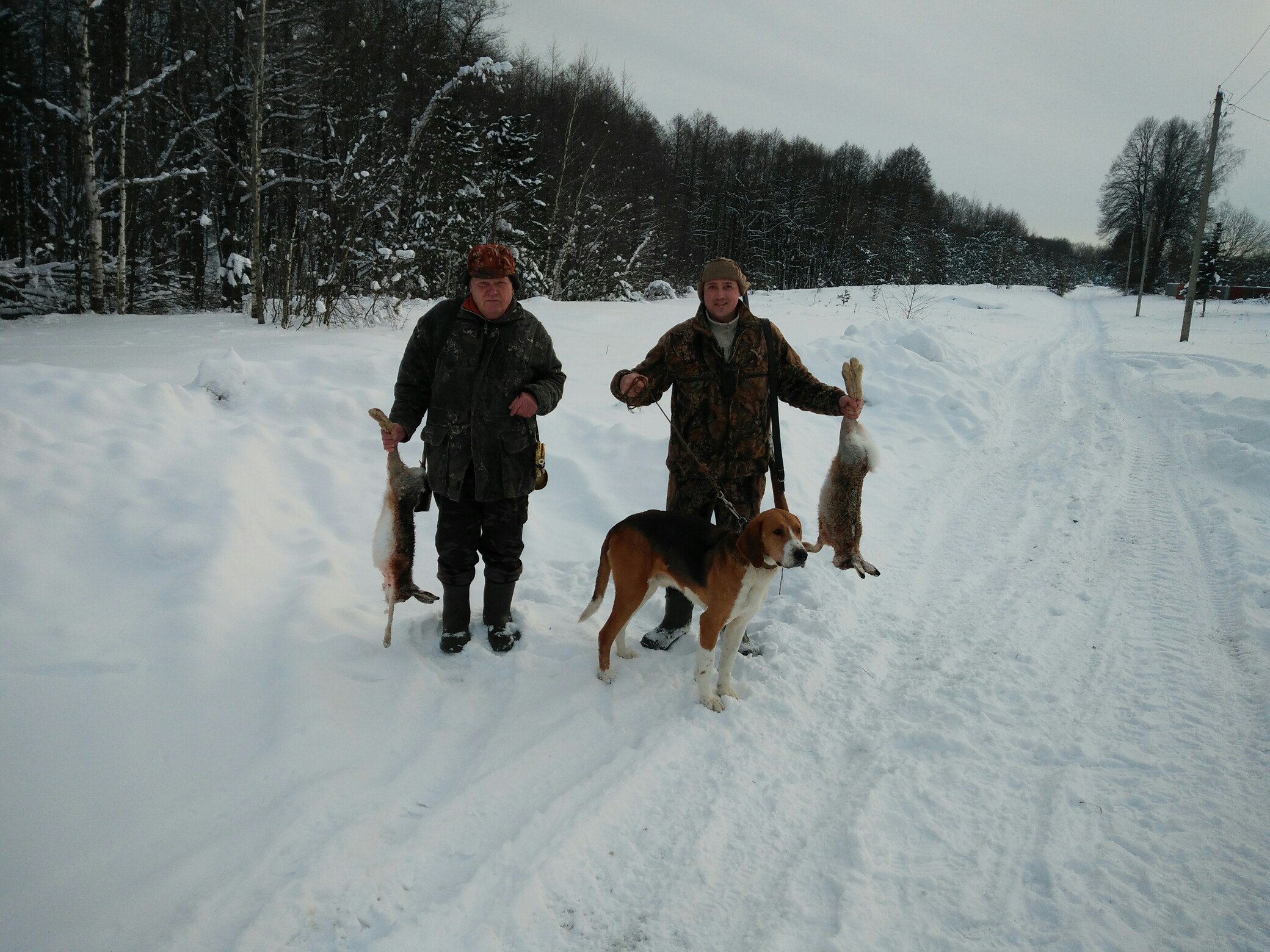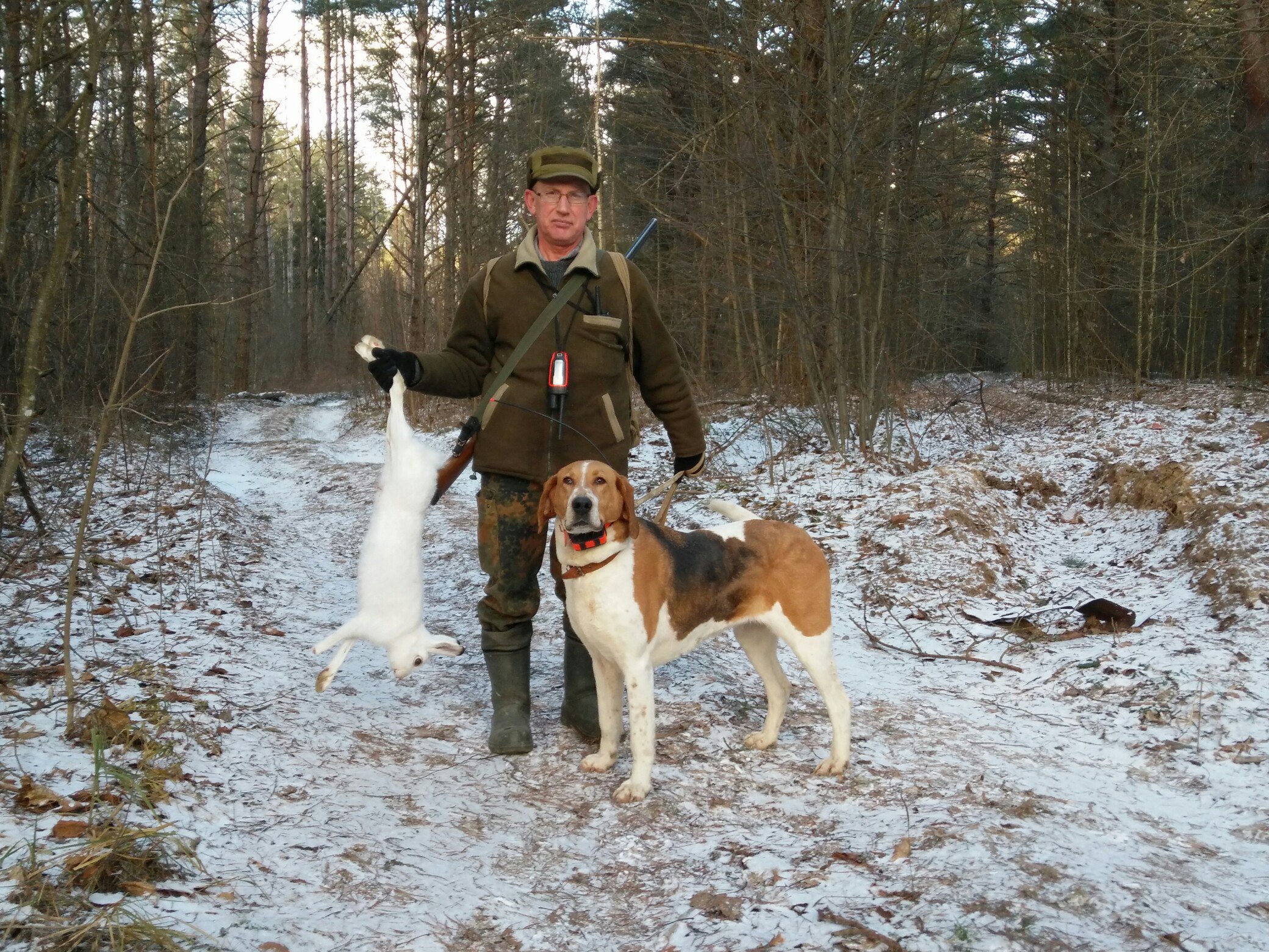 Вчера несмотря на сложную тропу,удачно погоняли зайца,на фото Соломенный Александр с Певкой и добытым беляком!