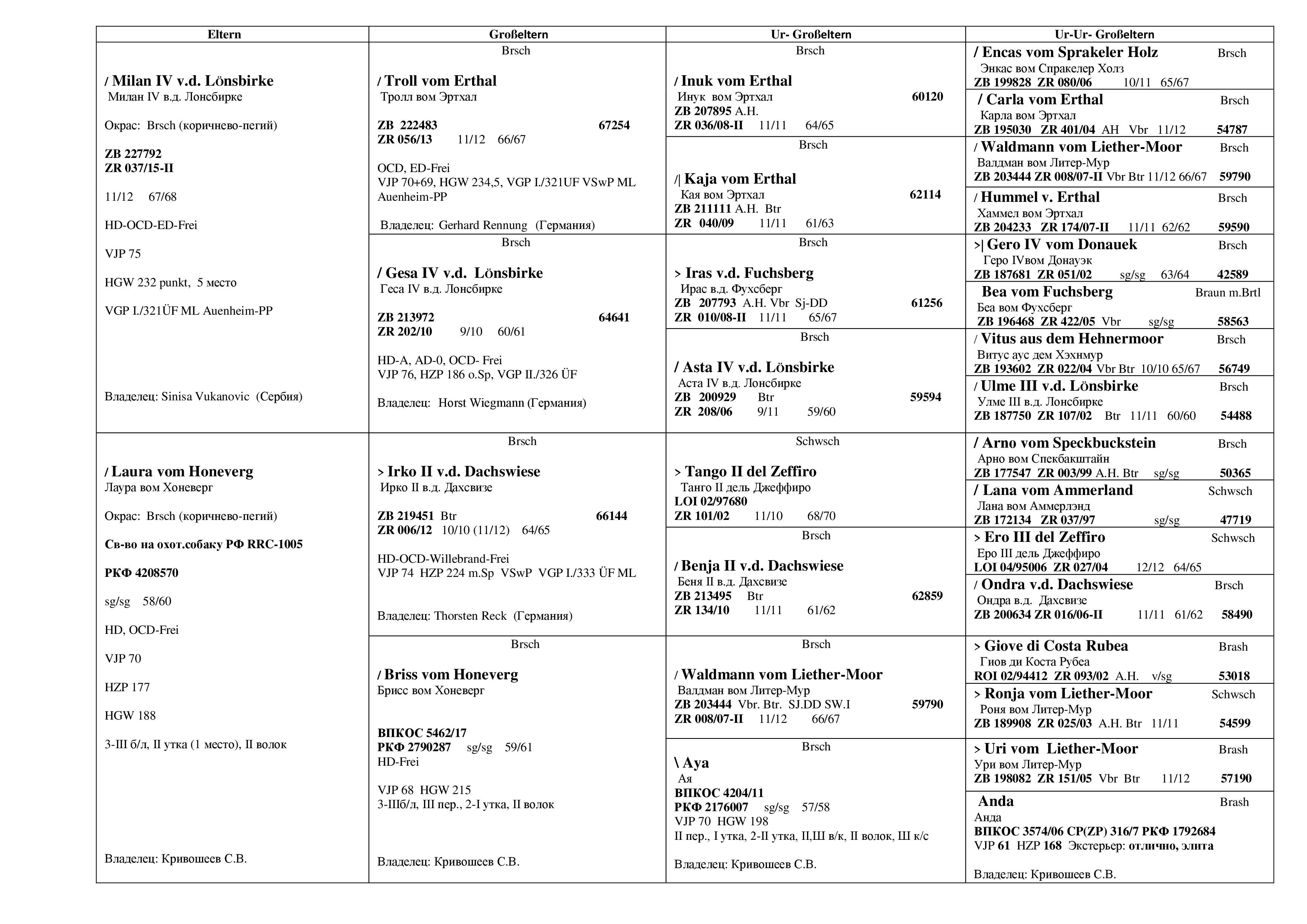 VJP: 76, HZP: 186 o.Sp, VGP: II./326ÜF, форма/шерсть: sg(9)/ sg(10), высота в холке/длина по корпусу: 60/61 см